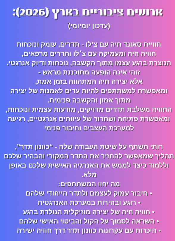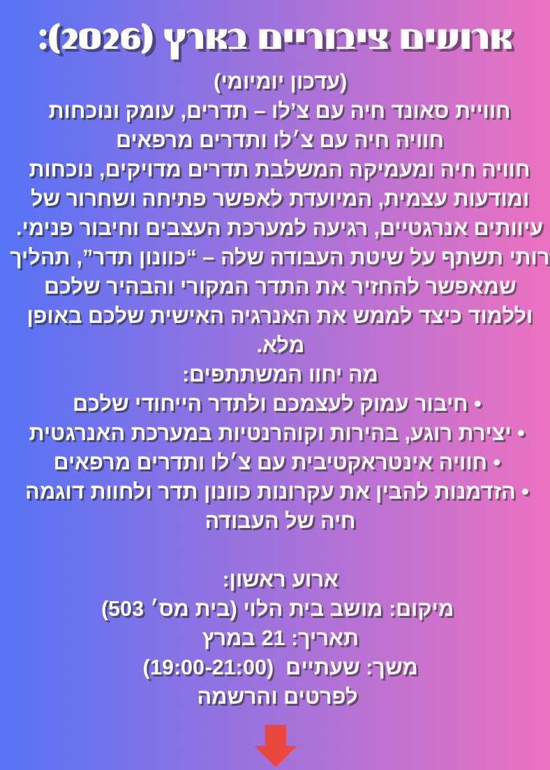 Events כרטיסים למסעות הצליל של רותי (מרץ- אפריל 2026) לגלות עוד על רותי צ’לי (מחנאי)• צפה בסרטוני יוטיוב